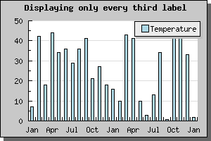 If we have an even larger data set it might not longer be meaningful to display all the tick marks since they would simple become to close. In JpGraph there is a possibility to specify that you only would like every n:th tick mark to be visible ( SetTextTickIntervall() ). For bar graphs using text scale however, that might not be such a good idea since the tick marks are between the bars and the labels centered under the bars. If we only were to display, say, every 3 tick mark it wouldn't look to good. Not that we can't do it, as the example below shows, but it just doesn't look very good.